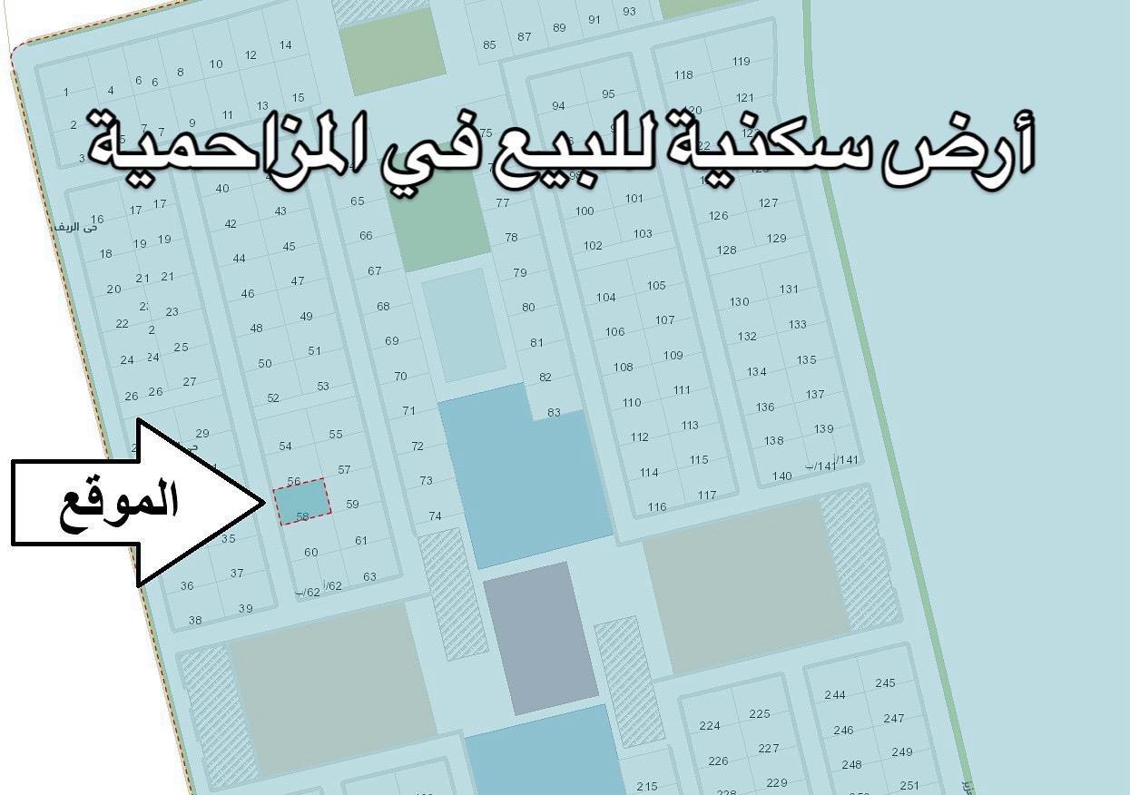 ارض سكنية للبيع في محافظة المزاحمية بحي الريف مخطط ٣٠٠ – قطعة رقم ٥٨ مساحتها ٦٣٠ متر على شارع ١٥متر غربية العرض على الشارع ٢١ متر بعمق ٣٠ متر
